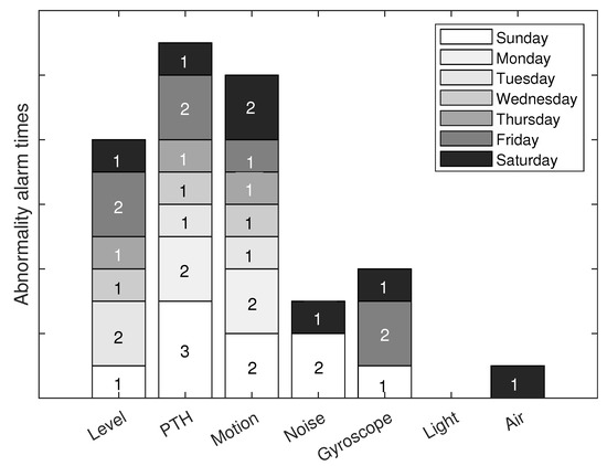 After a detailed analysis based on women and men separately to understand their degree of unconscious affectation, we will study the usefulness of the sensor network. Figure 17 describes the number of alerts by each sensor, due to an abnormality, per day of the week. The days of the week correspond to the colored boxes that each sensor has. The “x” axis has the labels of the types of sensors that make up the network. The “y” axis presents the number of alerts sent by each sensor on each day of the week. For example, on Sunday, the level sensor had 1 alert, the PTH sensor had 3 alerts, the motion sensor had 2 alerts, the noise sensor had 2 alerts, the gyroscope had 1 alert, the light and the air sensors did not present alerts. This graph gives an idea of the usefulness of the network for people. However, it is important to consider the false positives of the sensor alerts. In reality, an alert could have been the alarm of a possible accident or a cause that threatened the person’s health. With this figure, we observe the use of sensors by day of the week and its impact on sending alerts. We observe that the PTH sensor has the most significant impact due to the characteristics it measures. However, it only gives an idea of the general parameters of the home and that they could not necessarily put the person’s health at risk. The level sensor is the second sensor with the most significant impact on the network. It gives an idea of the person’s anomalous positions, which can indicate a fall. Light and air sensors contribute little to health care, but they improve people’s quality of life and comfort.