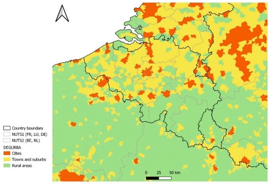21]. The DEGURBA is shown for Belgium and the border areas in