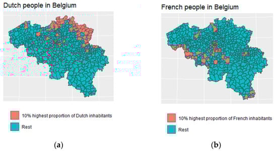 Figure 3, the municipalities with the 10% largest proportion of people with Dutch and French nationality are shown. The municipalities with the highest proportion of Dutch nationals are situated alongside the Dutch border in Antwerp and Limburg, while the municipalities with the highest proportion of French nationals are in Brussels and close to Lille.