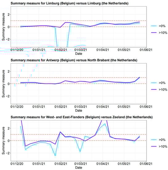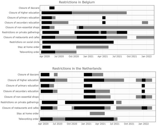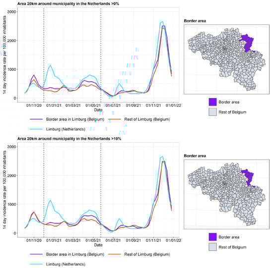 15]. On the Dutch–Belgian border, for example, there were weeks where non-essential shops, bars, and restaurants were closed in Belgium but open in The Netherlands and vice versa, leading to recreational border traffic. Arguably, this had an impact on the epidemic curves in the border regions.