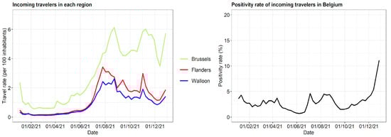 The data on the travel rate (Sciensano), i.e., the number of weekly incoming travelers per 100 inhabitants, and the positivity rate of incoming travelers doing a PCR test from January 2021 onwards are shown in