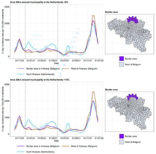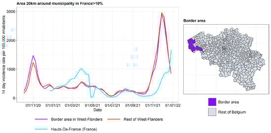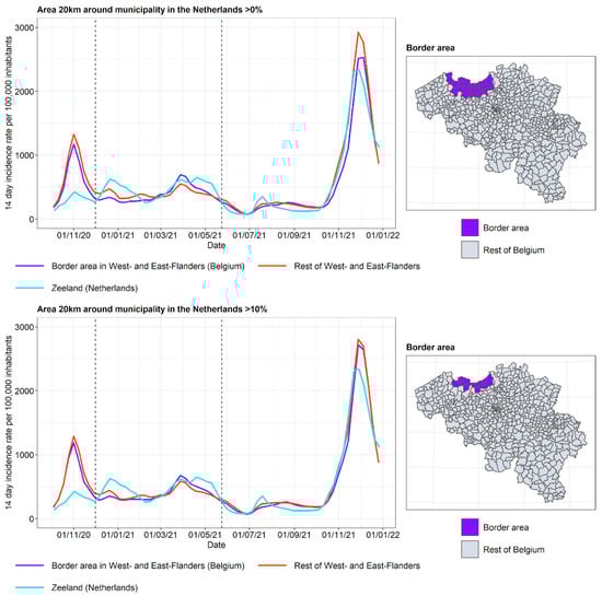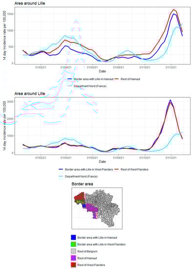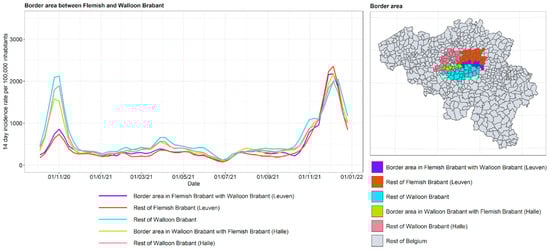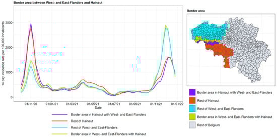 The goal of this paper is to examine the incidence curves in Belgium’s border areas and contrast these with the corresponding curves in the neighboring areas across the border, as well as in Belgium. It is hypothesized that the relationship between the incidence curves in the border areas and the incidence curves across the border depend on the social and economic ties, the urbanization level of the area, and the health measures that were in place in both Belgium and the neighboring countries throughout the pandemic. This would imply that, even when included in international travel restrictions, transborder mobility affects incidence in border areas. Similarly, the incidence curves relating to intranational regional and community borders are analyzed. It is hypothesized that weak mobility leads to a clear distinction in incidence curves between both sides of these borders, at certain times during the pandemic (autumn 2020, autumn 2021, and winter–spring 2022), when the corresponding national curves differed considerably. The study is limited to the period October 2020 to December 2021. During the first wave of the pandemic, the test capacities were limited, and the reported incidences were not representative of the true incidences. This period is therefore excluded from the analysis. In addition, the first part of 2022, with many European countries reporting the highest incidences so far, is not included in this paper. Studying the different health measures and their relationship to the incidence curves in Belgium and its neighboring countries during this period is a topic for further research.