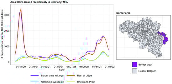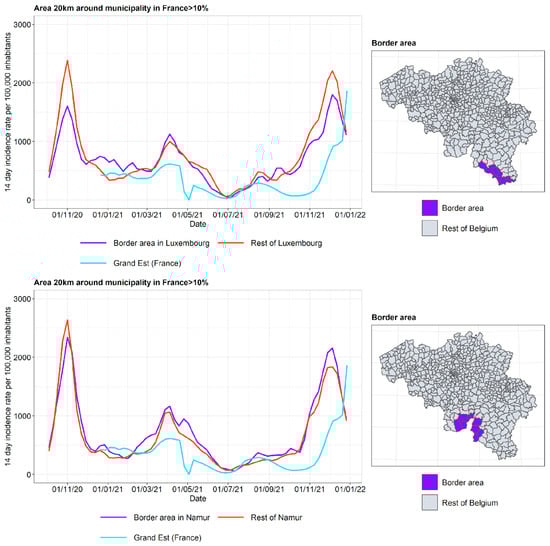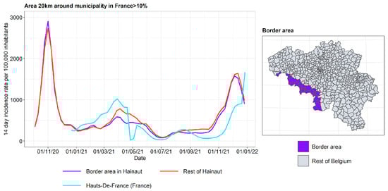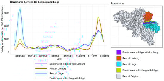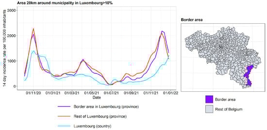 The Grand Duchy of Luxembourg had a visible impact on the incidence in the border region of BE-Luxembourg, especially in autumn 2021. In this case, cross-border travel is not related to a high degree of urbanization. A large number of people live in this rural and forested Belgian province and work in Luxembourg.