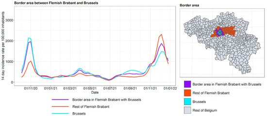 We performed a time-trend analysis of the 14-day COVID-19 confirmed case incidence at the level of Belgian provinces, well-defined border areas within Belgium, and adjacent regions in the neighboring countries. With the aid of line charts and representative maps, we assessed the relationship of these incidences with work-related border traffic, travel rates, the proportion of people with a different nationality, the stringency index of the non-pharmaceutical interventions, and the degree of urbanization at the level of the municipality. Data processing and analysis were performed in R 4.1.3, available from the Comprehensive R Archive Network (CRAN) at