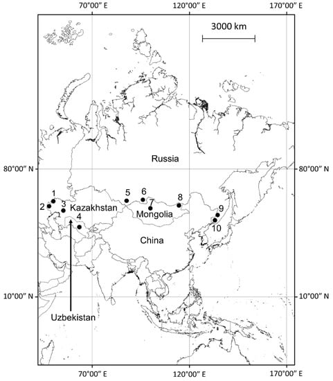 Field sites where Evgeniy Rotshild and his colleagues conducted investigations. Infection, animal species, region: 1—plague, the little souslik (Spermophilus pygmaeus), the Caspian Depression; 2—plague, the tamarisk jird (Meriones tamariscinus) and the midday jird (M. meridianus), the Caspian Depression; 3—plague, the great gerbil (Rhombomys opimus), the low part of Emba River, west Kazakhstan; 4—plague, the great gerbil (R. opimus), the Kyzyl-Kum Desert, Uzbekistan; 5—plague, the Pallas’s pika (Ochotona pallasi), the Altay Mountains; southern Siberia; 6—plague, the long-tailed ground squirrel (Urocitellus undulatus), Tannu-Ola mountains, Tuva, southern Siberia near Mongolian border; 7—plague, the Tarbagan marmot (Marmota sibirica), Khangai Mountains, Mongolia; 8—pasteurellosis, Mongolian gazelle (Procapra gutturosa), western Mongolia; 9—tick-borne encephalitis, small rodents of the genera Apodemus and Myodes, far-eastern Russia; 10—hantaviruses, small rodents of the genera Apodemus and Myodes, far-eastern Russia.