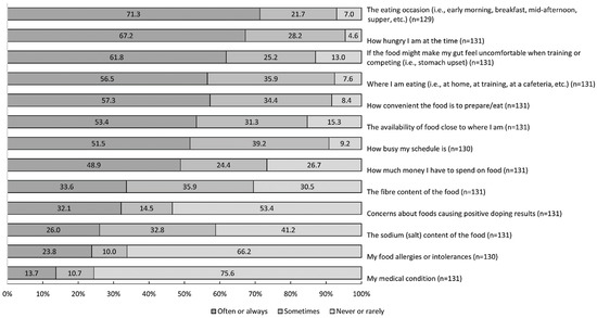 For the 13 additional items ‘eating occasion’ received the highest proportion (28.7%, n = 37) of responses as always being an influence on food choices, closely followed by ‘gut comfort’ (28.2%, n = 37) and ‘hunger’ (23.7%, n = 31) (Figure 1). In regard to doping concern, a greater proportion of never/rarely responses was reported from national and lower competition-level athletes (61.4%, n = 43) compared to Olympic (25.7%, n = 18) and other international-level athletes (12.9%, n = 9; X2(2) = 13.1, ϕc = 0.34, p = 0.001).