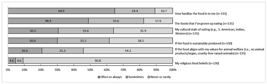 Figure 2 displays the proportion of responses to items within the ‘usual eating practices’ and ‘food values and beliefs’ factors. Analysis of the items against demographic characteristics identified significant differences for two items. Firstly, animal welfare was more frequently an influence for participants from individual sports (sometimes 30.9%, n = 29; never or rarely 46.8%, n = 44) compared to participants in team-based sports (sometimes 10.8%, n = 4; never or rarely 73.0%, n = 27, X2(2) = 8.07, ϕc = 0.18, p = 0.018, n = 131).