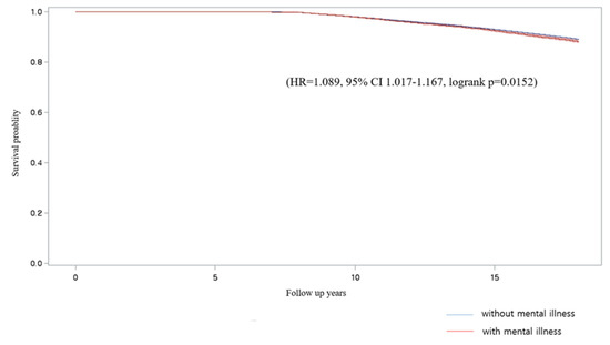 A total of 493,164 participants were included in the analyses—7199 (1.46%) were people with mental illness and 485,965 (98.54%) were people without mental illness. Of the participants, 50,995 (821 with mental illness and 49,974 without mental illness) died during the study period. The percentage of deaths from all causes was higher among people with mental illness than those without mental illness (11.40% vs. 10.28%, p = 0.0022). Figure 1 shows the Kaplan–Meier survival curve for people with and without mental illness. People with mental illness showed a lower survival probability than those without mental illness. Compared to people without mental illness, people with mental illness had a higher risk of all-cause mortality (HR 1.089, 95% CI 1.017–1.167).