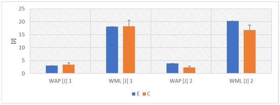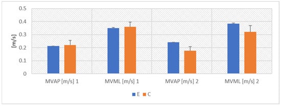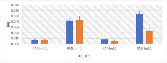 The Fisher’s posthoc NIR test showed that the results in groups E and C did not differ before the COVID-19 pandemic. After the end of the disease, all the parameters describing COM displacement worsened significantly in the athletes in group E (p < 0.001). The values in group E were also significantly worse than the results in group C (RAP—p < 0.001, RML—p < 0.001, MVAP—p < 0.01, MVML—p < 0.01, WAP—p < 0.01 and WML—p < 0.05) (Figure 1, Figure 2 and Figure 3).