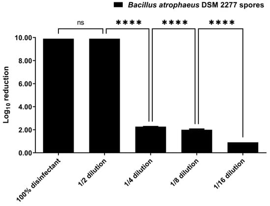 Log10 reduction achieved in disinfection of Bacillus atrophaeus DSM 2277 spores by suspension test with different disinfectant concentrations. VIRCOV BAC 360 disinfectant was tested at the following dilutions: 100% disinfectant; 1/2 (v/v) dilution; 1/4 (v/v) dilution; 1/8 (v/v) dilution; 1/16 (v/v) dilution. The contact time was 2 min. The error bars in the graph represent the standard deviation of the mean of three replicates (n = 3). Statistical difference between groups was evaluated by one-way analysis of variance (ANOVA) with post hoc comparisons made by the Tukey test. ns: not significant with p-value > 0.05; ****: significant with p-value < 0.0001.
