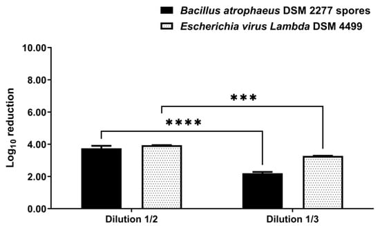 Log10 reduction achieved in disinfection of fabric by nebulization in a 0.08 m3 closet. VIRCOV BAC 360 disinfectant was tested at 1/2 (v/v) and 1/3 (v/v) dilutions. The indicators tested were B. atrophaeus DSM 2277 spores and bacteriophage Escherichia virus Lambda DSM 4499. The disinfection time consisted of 2 min of disinfectant nebulization plus 5 min of rest without nebulization. The error bars in the graph represent the standard deviation of the mean of two replicates (n = 2) for B. atrophaeus DSM 2277 spores tests and three replicates (n = 3) for bacteriophage Lambda DSM 4499 tests. Statistical difference between groups was evaluated by two-way ANOVA with post hoc comparisons made by the Tukey test. ***: significant with p-value < 0.001; ****: significant with p-value < 0.0001.