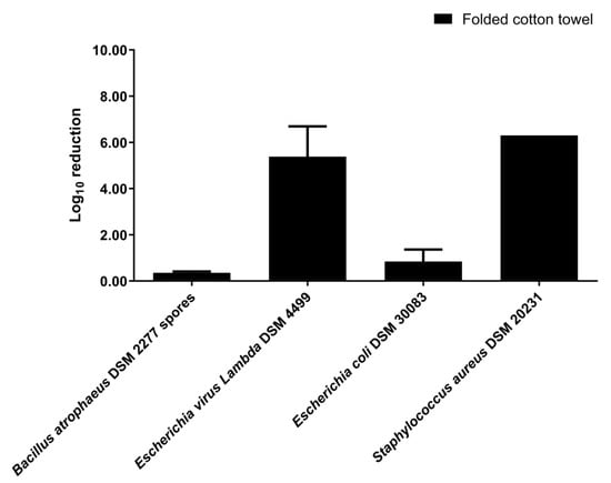 For the folded cotton towel disinfection, inoculated fabric swatches were placed inside the folded towel (Supplementary Materials Figure S4), and then the towel was disinfected by nebulization of disinfectant at 1/3 (v/v) dilution. The disinfection by nebulization of the folded cotton towel significantly reduced the number of viable Lambda DSM 4499 bacteriophages (p-value < 0.0001) and S. aureus DSM 20231 cells (p-value < 0.0001) (Supplementary Materials Figure S7). The log10 reduction of bacteriophage Lambda DSM 4499 and S. aureus DSM 20231 was 5.38 ± 1.31 (99.998% elimination rate) and 6.30 ± 0.001 (100% elimination rate), respectively (Figure 3). However, for B. atrophaeus DSM 2277 spores and E. coli DSM 30083, disinfection by nebulization did not significantly reduce the number of viable spores (p-value > 0.05) and cells (p-value > 0.05) (Supplementary Materials Figure S7).