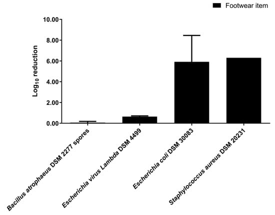 The disinfection by nebulization of the footwear item significantly reduced the number of viable E. coli DSM 30083 (p-value < 0.0001) and S. aureus DSM 20231 cells (p-value < 0.0001) (Supplementary Materials Figure S8). The log10 reductions of E. coli DSM 30083 and S. aureus DSM 20231 were 5.91 ± 2.55 (99.96% elimination rate) and 6.30 ± 0.001 (100% elimination rate), respectively (Figure 4). However, for B. atrophaeus DSM 2277 spores and bacteriophage Lambda DSM 4499, disinfection by nebulization in the 0.08 m3 closet did not significantly reduce their numbers (p-value > 0.05 for both) (Supplementary Materials Figure S8).