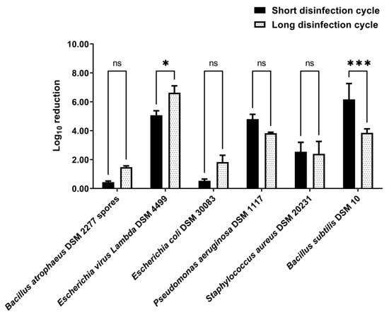 Log10 reduction achieved in disinfection of fabric by nebulization in the upscaled 0.58 m3 closet. VIRCOV BAC 360 disinfectant was used at a 1/3 (v/v) dilution. The indicators tested were B. atrophaeus DSM 2277 spores, bacteriophage Lambda DSM 4499, E. coli DSM 30083, Pseudomonas aeruginosa DSM 1117, S. aureus DSM 20231, and Bacillus subtilis DSM 10. For the disinfection time, a short disinfection cycle and a long disinfection cycle were tested. The short disinfection cycle consisted of 2 min of nebulization, 2 min of rest without nebulization, and 2 min of aerosol extraction from the closet interior. For its part, the long disinfection cycle consisted of 4 min of nebulization, 4 min of rest without nebulization, and 2 min of aerosol extraction from the closet interior. The error bars in the graph represent the standard deviation of the mean of three replicates (n = 3). Statistical difference between groups was evaluated by two-way ANOVA with post hoc comparisons made by the Tukey test. ns: not significant with p-value > 0.05; *: significant with p-value < 0.05; ***: significant with p-value < 0.001.