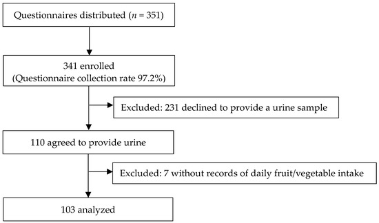 We recruited the participants from a local girls’ junior high and high school. A total of 351 students were invited to participate in the study and the study questionnaires were distributed to them. They were asked to answer questions about their daily fruit and vegetable intake, awareness of the current recommendations for V/F consumption, and their weekly physical exercise, among others. Three hundred and forty-one individuals answered the questionnaires (response rates: 97.2%), of which 231 were excluded because they declined to provide urine samples, and 7 were excluded due to missing responses to the daily fruit/vegetable intake questions. Finally, a total of 103 individuals (aged 12–18 years) who completed the questionnaires and agreed to provide urine samples were included (Figure 1).