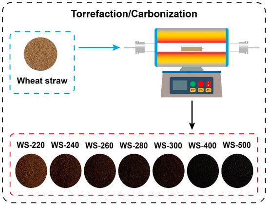 As displayed in Figure 1, torrefaction/carbonization of WS was operated in a horizontal tubular furnace. The reactor was initially purged with Ar at a flow rate of 100 mL/min for 30 min. WS was then torrefied in the horizontal tubular reactor at varying temperatures (220, 240, 260, 280, and 300 °C) with a consistent residence time of 1 h. Additionally, carbonization of WS was also conducted in the horizontal tubular reactor at 400 and 500 °C by using the same experimental procedures. The torrefied/carbonized WS feedstocks were labeled as WS-X, and X represents the treated temperature.
