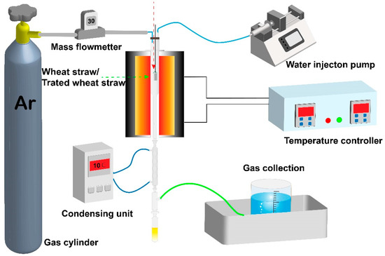 As shown in Figure 2, the experimental apparatus was made of a gas/steam supplying system, a vertical tubular furnace with a temperature controller, a condensation system, gas collection system, and so forth. The quartz reactor was assembled in the vertical furnace. In all tests, raw or torrefied/carbonized WS with a consistent weight (1.5 g) was preloaded in a quartz sampling basket, and the bottom of the basket was porous for the emission of volatiles. Prior to the test, the quartz basket was hung outside of the furnace. The gasification system was first purged with Ar at a flow rate of 100 mL and then preheated to 250 °C. When reaching 250 °C, the Ar flow rate was stopped, and the sampling basket was rapidly pushed into the gasification system to initiate the experiment. At the same time, water was pumped into the reactor using a syringe pump at a rate of 0.2 mL/min, and steam was generated once the water flowed into the reactor. Before terminating each experiment, the system was continuously elevated to the desired temperature (700–900 °C) from 250 °C at 10 °C/min and maintained for a certain time to ensure the total residence time equaled 75 min. Finally, the gas products from the gasification system passing through the condensation system were collected for further GC analysis. The condensed tar was trapped in a condensing system, and we used the same ethyl acetate (30 mL) to wash the tar stuck to the condensation system, and the ethyl acetate-soluble tar phase was collected for further GC/MS. For each test, several repeated runs were conducted to assure the repeatability of the results.