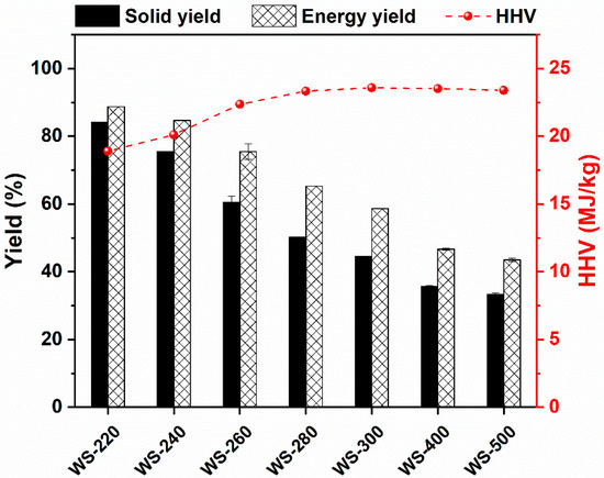 The mass yield, energy yield, and HHV of WS torrefied/carbonized at various temperatures are demonstrated in Figure 3. Obviously, the treated temperature strongly affected the mass and energy yield of torrefied/carbonized WS. The mass and energy yields of torrefied/carbonized WS gradually declined with the increasing treated temperature. The mass yield was high (>84%) when the torrefaction temperature was kept at 220 °C, while it dramatically dropped with further increasing the treated temperature. For instance, the solid yield was reduced to only 44.58% at 300 °C, which was comparable with the result reported elsewhere [28]. When the treated temperature was elevated to the carbonization temperature range, i.e., 400 °C and 500 °C, the mass yield declined to ~35%, suggesting the relatively entire carbonization of WS.