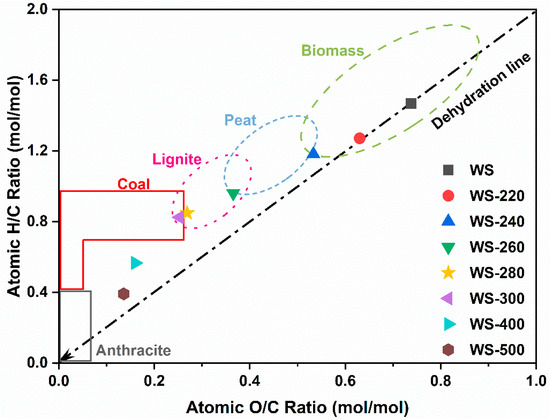 The H/C and O/C atomic ratios of the torrefied/carbonized WS feedstocks were further compared with other solid fuels in the Van Krevelen diagram in Figure 4. With the increase in torrefaction/carbonization severity, the atomic ratios of H/C and O/C were graduated reduced, ca. from 1.27 and 0.63 for WS-220 to 0.39 and 0.14 at for WS-500. Notably, the atomic ratios of H/C and O/C of WS-220 and WS-240 almost showed a linear correlation with a scope of 2, indicating that dehydration was the dominant reaction taking place during the torrefaction at the low temperatures [28]. With the increase in the pretreated temperature, the decarboxylation and decarbonylation reactions were intensified, thereby making the corrections of H/C and O/C atomic rations nonlinear. These findings suggested that WS torrefaction was a mild carbonization process accompanied by dehydration and deoxygenation reactions. The main devolatilization reactions during torrefaction usually contained dehydration, decarboxylation, and decarbonylaiton reactions [3]. The H/C and O/C atomic ratios of the pretreated WS at the high treated temperatures were even close to coal and anthracite, implying the improvement of the fuel properties of these torrefied/carbonized WS. Accordingly, it was inferred that the variations in the atomic H/C and O/C ratios were attributed to a sequence of reactions taking place during the torrefaction/carbonization of WS.