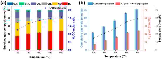Upon the increase in gasification temperature, a considerable increase in gas yields was achieved, as demonstrated in Figure 5b. It was noteworthy that the elevation of gasification temperature in the range of 700–900 °C was beneficial for the increase in the cumulative gas yield. As the gasification temperature was promoted, the endothermic reactions, including water gas reactions [48] and tar reforming reactions [20], could be improved, contributing to the H2 formation. Correspondingly, both the H2 and syngas yield was dramatically enhanced with the increase in gasification temperature. As such, the CO yield gradually increased with the increase in gasification temperature, suggesting that the water gas reactions were always more dominant than the WGS reaction [28], giving rise to both the increases in H2 and CO yields. The maximum cumulative gas yield, H2 yield, and syngas yield were all achieved when the gasification temperature was kept at 900 °C, reaching 75.89 mmol/g, 36.41 mmol/g, and 58.97 mmol/g, respectively. It was proven that the steam reforming reactions, including the WGS reaction and steam–methane-reforming (SMR) reaction, were responsible for the increase in gas yields [39,49].