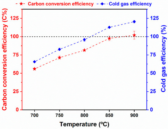 The carbon conversion efficiency and cold gas efficiency were also used to demonstrate the thermal conversion degree of WS for gas production. As expected, the two indicators revealed ascending tendencies in the range of 700–900 °C, as shown in Figure 6. That was because the higher gasification temperature facilitated the gasification reaction rates, resulting in more generation of gas productions. More specifically, the CCE and CGE results obtained at 700 °C were only 55.92 C% and 65.71%, respectively, while the effluent gas product obtained at 900 °C showed the highest CCE (nearly 100 C%) and CGE (120.41%). It was inferred that the gasification temperature of 900 °C was preferred because of the complete carbon conversion into gas fractions. Similarly, other studies also found that the steam gasification of biomass at 900 °C is optimal for syngas production [50,51]. Thus, the steam gasification at 900 °C was used as the preferred condition for the following steam gasification operations.