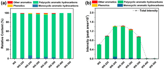 To reveal the effect of torrefaction/carbonization on tar formation from steam gasification of torrefied/carbonized WS, the total ion chromatograms originating from steam gasification of raw and torrefied/carbonized WS feedstocks are illustrated in Figure 7. Even though the relative peak area of each compound cannot represent the actual tar yield, it can provide insight into the effect of torrefaction/carbonization severity on the variation tendency of tar yield from the steam gasification process. As displayed in Figure 7a, the constituents of tar were classified into monocyclic aromatic hydrocarbons (MAHs), polycyclic aromatic hydrocarbons (PAHs), phenolics, and other aromatics, and the most dominant components in tar were PAHs and MAHs. As demonstrated in Figure 7b, WS-220, WS-240, and WS-260 did not present the contribution to tar elimination; that was because WS torrefied at the low temperature range (220–260 °C) was more difficult to be reformed, resulting in more tar formation. This outcome was in agreement with the study reported elsewhere [28]. However, the tar intensity gradually declined with the promotion of treated temperature from 260–500 °C, which was possibly due to the fact the higher carbonization degree caused by the higher torrefied/carbonized severity made the torrefied/carbonized WS less reactive and generate less volatiles to form tar. Apparently, the carbonized WS feedstocks (WS-400 and WS-500) exhibited very low tar intensities in comparison with both raw WS and torrefied WS feedstocks, and the lowest tar content was achieved from steam gasification of WS-500. It was assumed that the carbonization of hemicellulose and cellulose at 400 and 500 °C proceeded with severe polycondensation and carbonization reactions to generate carbonized intermediates with aromatic structures [53]. Furthermore, the pre-removal of tar precursors (such as holocellulose-derived oxygenates and phenyl units) was successfully fulfilled during the high-severity torrefaction and carbonization of WS [16]. It was concluded that the pre-removal of holocellulose-derived oxygenates and lignin-derived phenols during biomass torrefaction/carbonization could lower the generation of tar precursors during subsequent steam gasification, contributing to the reduction in tar content.