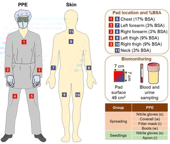 Features of the biological assessment. On the left are reported the body locations of the 11 pads used in the patch-based monitoring of ETU levels, applied on both working clothes and skin. On the right, for each pad is indicated the location and the corresponding represented percentage of body surface area (BSA). Additionally, the biomonitoring procedures (i.e., pad surface, end-of-shift blood, and urine sampling), and the personal protective equipment (PPE) used are indicated. Abbreviations: s, single use; w, washable; r, reusable.