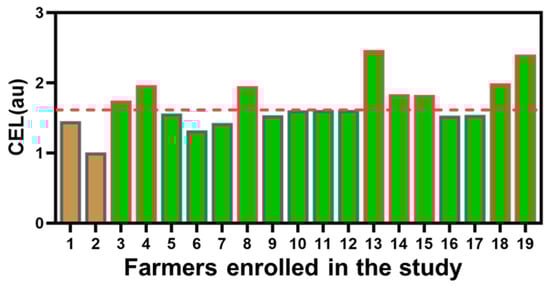 Chronic exposure levels (CELs) in MNZ-exposed workers. Numbers from 1 to 19 in the x axis univocally identify each subject enrolled in the study. Brown bars indicate CEL values calculated for spreading workers, green bars indicate CEL values calculated for seedling workers. Red dotted line at 1.61 au indicates the cut-off median value. Bars with red borders indicate samples with CEL au values above the cut-off limit.