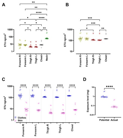 Levels of ETU measured in the pads located on the skin and on the clothes. (A) Levels of ETU expressed in ng/cm2 detected in skin pads. (B) Levels of ETU expressed in ng/cm2 detected in clothes pads. (C) Levels of ETU expressed in ng/cm2 detected in pads of same body location of both skin and clothes. (D) Box plot showing the potential and actual exposure values (expressed in mg) considering all the enrolled subjects. (A,B) Yellow circles, forearm; red circles, thigh; grey circles, chest; green circles, neck. (C,D) Blue circles, pads applied on clothes; pink circles, pads applied on skin. (A–C) Friedman test multiple comparisons with Dunn’s post-test. (D) Wilcoxon test matched pairs. Data are reported as dot plots with median values. * p < 0.05; ** p < 0.01; *** p < 0.001; **** p < 0.0001. Where no asterisk is reported, the comparison between groups is not significant.