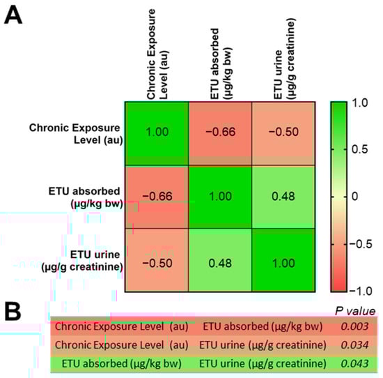 ETU exposure correlation matrix in greenhouse workers. (A) Spearman’s correlation matrix between chronic exposure levels (arbitrary units, au), ETU absorbed (µg/kg bw) and ETU measured in urine (µg/kg creatinine). Within each square, the corresponding r Spearman value is indicated, with associated color-code: green meaning a positive correlation, and red meaning a negative correlation. (B) p values corresponding to correlation values.
