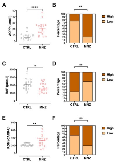 Specifically, in MNZ-exposed individuals and non-exposed controls, median AOPP serum levels were 20.4 and 6.4 µmol/L, respectively (p < 0.0001), and median ROM serum levels were 334 and 212 CARR-U, respectively (p = 0.0018). In line with these results, BAP serum levels were 1529 and 2084 µmol/L (p = 0.020), respectively, in MNZ-exposed individuals and non-exposed controls. To evaluate the predictive value of such differences, contingency analyses with Fisher exact test were conducted, demonstrating that specifically AOPP levels measurement in serum might additionally have a significant predictive value (Figure 5B,D,F; p = 0.0012).