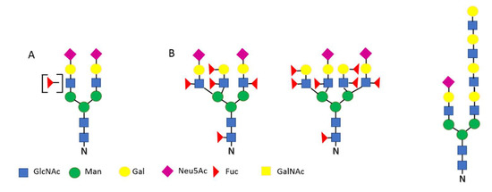 Already in the 1990s, it was noticed that significant changes in the glycosylation pattern are associated with disease processes and in many cases may even be considered disease markers [30,31,32]. Until now, certain features of the oligosaccharide structures were indicated as disease related (Figure 1B and Figure 2B), including: