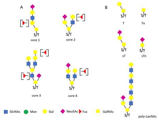 Examples of typical O-glycan structures; (A) dominant in healthy humans, (B) disease-related.