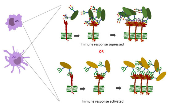 The C-type lectins group is distinguished by their common demand of calcium ions for ligand binding [56,57,58,59]. This group mostly includes proteins that reside on the outer surface of cells. Galectins are soluble proteins, specific for β-galactosides [60,61,62,63,64]. The siglecs, belonging to the immunoglobulin superfamily (I-type lectins), recognize terminal sialic acid residues [65,66,67,68]. Immune cells are especially rich in lectin residents. Many types of cells create the immune system, with different origins, degrees of maturity and differentiation, and functions. Their orchestrated operation allows for mutual communication, transfer of information on the status of the encountered antigens, and extremely precise control of the immune response. Dendritic cells (DCs) are believed to be the major players in regulating this response [69,70,71]. Depending on their subtype (origin), as well as the stimulating factors present in the microenvironment, dendritic cells can induce a pro-inflammatory response or trigger tolerogenic reactions. Peripheral dendritic cells capture antigens, internalize them and, after processing, present them on the surface in the context of MHC II to T-cells in the lymph nodes. Their response aims to recognize the pattern of “foreign” antigens presented by pathogens (PAMPs, pathogen associated molecular pattern) and self, but somehow damaged cells (DAMPs, damage/danger associated molecular pattern) in order to be destroyed and removed by the effector cells. On the other hand, a similar mechanism prevents effector response to self-associated antigens (SAMPs) [72,73]. In some situations, the immune system may not achieve the appropriate balance. The result may be an undesired inflammatory reaction towards the own cells or tissues, as in autoimmune diseases and allergies, but also the lack of demanded reaction, which results in the evasion of pathogens or tumor cells from the control of the immune system and, consequently, disease progress. In the latter case, we most often deal with overexpression of SAMPs (self-associated) antigens on the cell surface. To accomplish these tasks, the surface of the DCs is decorated with numerous PRRs (pattern recognition receptors), which include TLRs, NLRs, RLRs and—as mentioned earlier—numerous lectins. When DCs remain immature, their further interactions support tolerogenic reaction. Mature DCs, fully differentiated, induce an effector T-cell response [74,75,76]. The above-mentioned general directions work through complex signaling pathways, supported with many other factors. For more detailed information on DCs roles in immunity the reader is referred to the reviews of van Vliet et al. [77], Tisch [78], Waisman et al. [79], and many others.