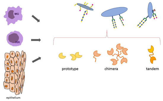 Siglecs belong to the superfamily known as sialic acid specific immunoglobulin-like lectins. They are transmembrane receptors expressed in numerous subpopulations of immune cells. Extracellular CRD recognizes sialic acid, a crucial monosaccharide that terminates oligosaccharides of mammal N- and O-glycoproteins (Figure 6). For this reason, siglecs are considered self-associated molecular pattern (SAMP) receptors and Siglec–Neu5Ac interaction as a physiological mechanism that prevents over-activation of the immune system [67,68,103]. Tumor cells may exploit Neu5Ac/Siglec interaction for modulation of immune cell function, supporting an immunosuppressive tumor microenvironment [113]. The human genome includes 14 genes coding the proteins belonging to the siglecs family. Regarding their evolution, siglecs can be divided into two subgroups. Group 1 includes highly conservative siglecs 1, 2, 4, and 15. Their orthologs can be found in all groups of mammals. Group 2 is referred to as CD-33-related and comprises human siglecs 3, 5–11, 14, and 16. These proteins had been subjected to rapid evolution, and therefore the repertoire of their representatives expressed in different mammals is also diversified. Group 1 siglecs are considered the inhibitory receptors. They contain an intracellular ITIM (immunoreceptor-tyrosine based inhibitors motif) or similar (ITIM-like) domain. When bound to sialoglycans, these receptors transmit an intracellular signal that blocks the synthesis of pro-inflammatory cytokines and activation of the immune system. Inhibition of Toll-like receptors (TLRs) is also involved in this signaling pathway [113,114,115,116].