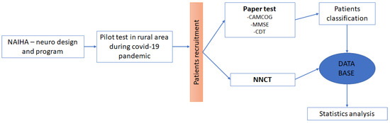 In the first phase of the research, the design and computer programming of both the NAIHA (Natural and Artificial Intelligence Health Assistant)-neuro tool and the NAIHA Neuro Cognitive Test (NNCT) were conducted, designed by psychogerontology professionals and programmed by computer engineers.