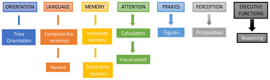 It should be noted that, although the format of the games is always the same, they are dynamic. That is, for example, in the “Complete the sentence” game, the sentence varies if the same user completes the test twice over time. For this purpose, it has been considered that all the sentences, images and/or stimuli to be presented have the same level of difficulty. Figure 2 shows the cognitive areas and exercises used in the NNCT: