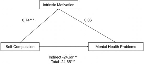 Parallel mediation model: self-compassion as a predictor of mental health problems (depression, anxiety and stress), mediated by intrinsic motivation (incomplete). *** p < 0.001.