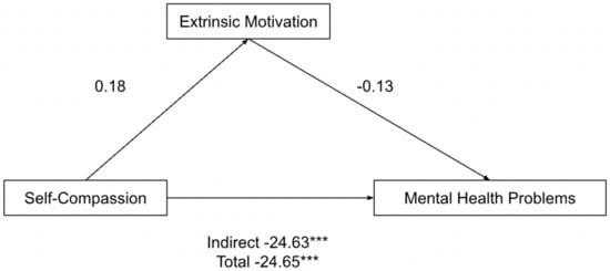 Parallel mediation model: self-compassion as a predictor of mental health problems (depression, anxiety and stress), mediated by extrinsic motivation (incomplete). *** p < 0.001.