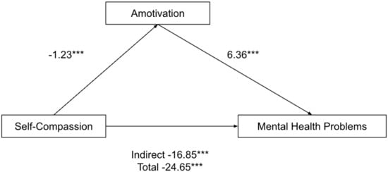 Parallel mediation model: self-compassion as a predictor of mental health problems (depression, anxiety and stress), mediated by amotivation. *** p < 0.001.