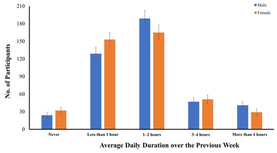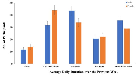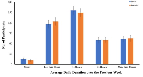 As compared to smartphone use, more male (n = 35) and female (n = 42) adolescents reported no computer use over the previous week, and only 91.0% (n = 783) were computer users during COVID-19 (Figure 2). On average, 26.4% of early adolescents used their computers for less than one hour, 27.1% used their computers for one to two hours per day, 15.0% used their computers for three to four hours per day, and 22.6% used their computers for more than four hours per day. Unlike smartphone use, there was a significant difference between early male and female adolescents in their average daily time spent using a computer over the previous week, in both the parametric, t(1, 858) = 2.288, p < 0.05, and nonparametric tests, U = 83,885.5, z = 2.417, p < 0.05. In general, early male adolescents had spent more time on computers than early female adolescents over the previous week. While only 20.2% of early female adolescents (n = 87) had used their computers for more than four hours per day, more early male adolescents (n = 107, 24.8%) had used their computers for similar hours per day over the previous week.