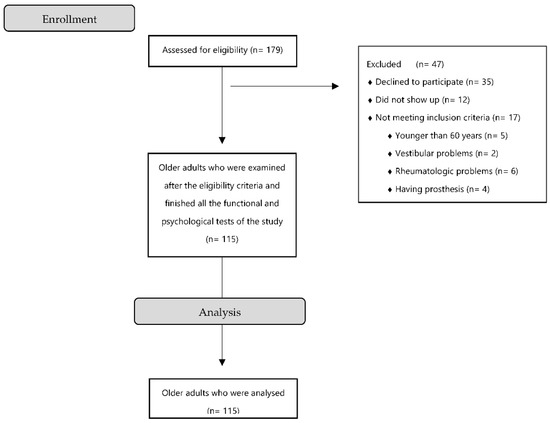 This was a cross-sectional descriptive and analytical study that involved a total of 115 older adults over 60 years of age, who were randomly selected through the department of Social Affairs of the City Council of Malaga and the City Council of Pizarra (Malaga) (Figure 1). The inclusion criteria for this study were: adults over 60 years of age who are registered as residents of the municipalities of Malaga and Pizarra. Exclusion criteria were: having central or peripheral neurological alterations, rheumatological diseases, serious somatic or psychiatric diseases, severe cognitive impairment, pacemakers or prostheses and any type of alteration or pathology that could alter balance and functional activity (such as auditory or vestibular alterations). This study was approved by the Ethics Committee of the University of Jaén with protocol code DIC.17/5.TES (approved on 19 February 2018) and was carried out taking into account the guidelines of the Declaration of Helsinki. Before the study was carried out, all participants signed their informed consent.