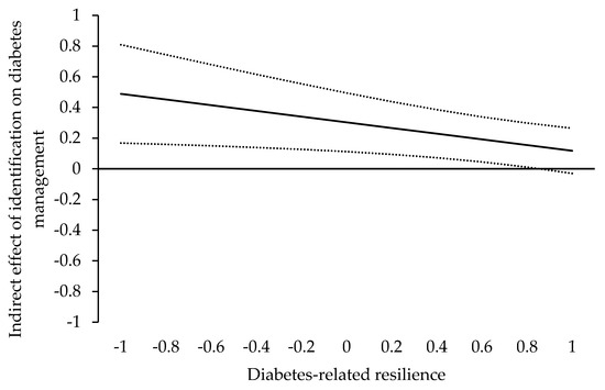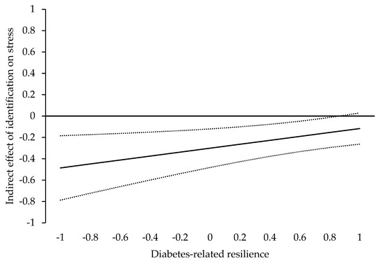 The index of moderated mediation for diabetes-related stress as outcome variable was significant (γ = 0.18, SE = 0.08, p = 0.018, 95% CI: [0.031, 0.337]). Here, the positive regression weight indicates that the negative indirect effect of identification on diabetes-related stress via social support gets smaller (i.e., closer to zero) when diabetes-specific resilience values increase. More specifically presented in Figure 3, for resilience values = 0.86 (on a standardized scale), the indirect effect is still significant (γ = 0.14, SE = 0.07, p = 0.048, 95% CI: [−0.284, −0.001]); however, for values exceeding 0.86, the indirect is no longer significant (γ = −0.14, SE = 0.07, p = 0.052, 95% CI: [−0.2843, 0.001] for resilience values = 0.87 on a standardized scale). Conclusively, our results support H6b.