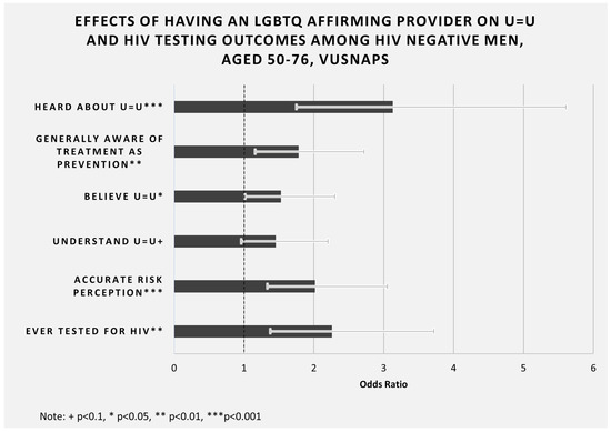 Effects of having an LGBTQ affirming provider on U = U and HIV testing outcomes among HIV negative men, aged 50--76, VUSNAPS. Note: Adjusted odds ratios are presented for HIV negative men only from the analyses presented in Table 2, Table 4, Table 5, Table 6 and Table 7. Analyses control for state of residence, age, education, race/ethnicity, partner status, ever tested for HIV (except for models where this is the outcome), and ever heard of U = U (except for models where this is the outcome). All odds ratios are significant at the p < 0.05 level or higher, except “Understand U = U”, which is significant at the p < 0.1 level.