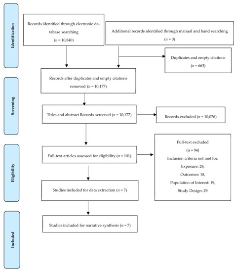 - Moola, S.; Munn, Z.; Tufanaru, C.; Aromataris, E.; Sears, K.; Sfetcu, R.; Currie, M.; Qureshi, R.; Mattis, P.; Lisy, K.; et al. Chapter 7: Systematic reviews of etiology and risk. In Joanna Briggs Institute Reviewer’s Manual; Aromataris, E., Munn, Z., Eds.; The Joanna Briggs Institute: Adelaide, Australia, 2017; Available online: https://reviewersmanual.joannabriggs.org/ (accessed on 16 June 2021).