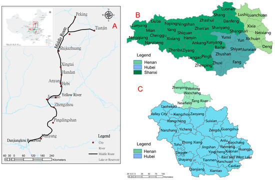Range of influence of SNWTP-MR. ((A) is the whole process of water transfer in the SNWTP-MR; (B) is the scope of the water source area for water transfer; (C) is the downstream of the water source area).