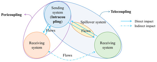 The metacoupling system is a set of two or more coupled systems that interact internally as well as nearby and far away, facilitated by agents affected by various causes with various effects [17]. The entire metacoupling system consists of a sending system, receiving system, and spillover system (Figure 2), among which the sending system provides materials and information for the entire coupling; the receiving system obtains materials and information from the sending system and provides energy and capital for the sending system; while the spillover system is the area affected by the transfer of materials and information, and is the medium for the transfer between the receiving system and the sending system. Further, the metacoupling framework can be divided into three parts: intracoupling, pericoupling and telecoupling [17] (Figure 2).