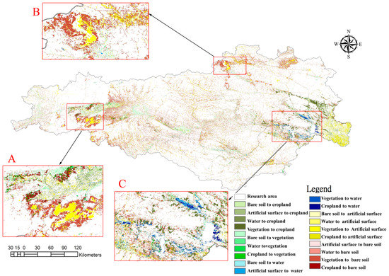 The intracoupling of SNWTP-MR refers to the interactions between different types of land use in Danjiangkou water source areas, so it is necessary to analyze their patterns of spatial and temporal change pattern. Based on the satellite remote sensing images of the Danjiangkou water source in 2013 and 2019, we classified the land use type by the Threshold method of eCognition 8.7 software (Developed by Trmible, Sunnyvale, CA, USA) and the Pretreatment method of ENVI 5.1 software (Developed by Exelis Visual Information Solutio, Boulder, CO, USA) (including radiation calibration, atmospheric correction, image mosaic, image cropping). According to the theories of Costanza et al. and Yang Guoqing [21,22], when calculating the ecological service value and ecological risk, land use is mainly divided into five categories, and this study also continues this classification. The categories include: Plowland (paddy field, dry land), Vegetation (woodland, bush, open woodland, other woodland, high coverage grass, medium coverage grass, low coverage grass), Water (canals, lake, reservoir pond), Artificial Surface (urban land, rural settlement), and Bare Soil (sandy ground, Gobi saline-alkali land, bare earth, bare rock texture) (Figure 4 and Figure 5). The “accuracy assessment” analysis index was used for accuracy verification. The specific method is to compare and test the drawings analyzed in this study using the vector files of the identified land types on the software. The verification result is: the accuracy of the classification in 2013 is about 87%, about 85% in 2019, so the accuracy is high. This can be seen from the changes in land use (Figure 6). From the red circles A and B in Figure 6, it is also found that there is obvious land development; at the same time, the expansion of the reservoir increases the water area significantly (the red circle C in Figure 6), which will provide a solid foundation for remote water transfer.