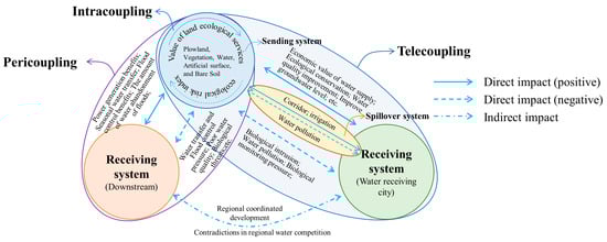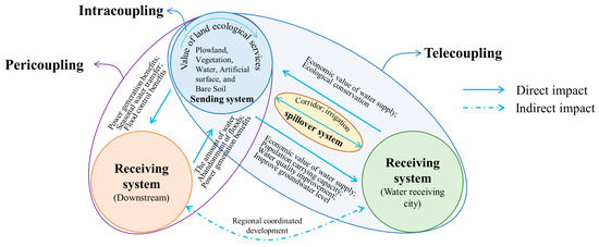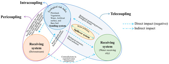 - By analyzing telecoupling, the interaction among the sending system, the receiving system and the spillover system can be seen. From the perspective of ecological value, the sending system obtains a large amount of income from water transfer; the receiving system has greatly improved the urban domestic water consumption. For example, the water volume for consumption has been increased by 9.5 billion m3, and the hardness of tap water has also dropped from 380 mg∙L−1 to 120–130 mg∙L−1, and the problem of over-exploitation of groundwater has been alleviated. The population carrying capacity of the water resources has increased by 16.42 million people, and the spillover system has created a cross-regional green ecological landscape belt that can create a value of 189 million yuan of environmental purification benefits. From the perspective of ecological risk, both biological invasion and water pollution have become problems that all systems need to face together.