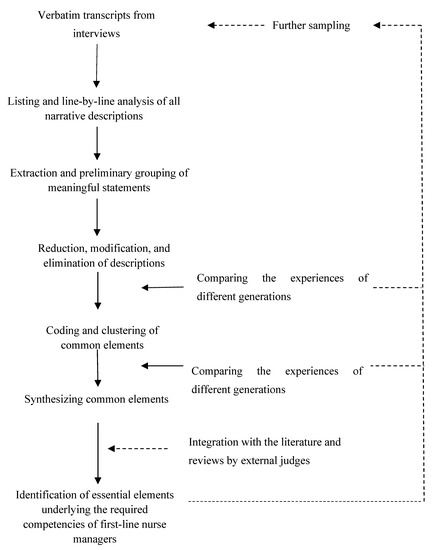 Interview transcripts were analyzed using Van Kaam’s controlled explication method. It involves the processes of (1) immersing oneself in the phenomenological texts; (2) listing and categorizing meaningful descriptions; (3) reducing and eliminating overlapping and redundant descriptions; (4) clustering and deriving common elements from the descriptions; and (5) confirming the common elements by asking external judges to validate the phenomenological analysis [22]. Comparisons of the lived experiences and perceptions of the informants were constantly made, particularly between those of the first-line nurse managers and frontline nurses of different generations, so as to identify commonalities and differences in their viewpoints concerning what constitutes the competencies required of first-line nurse managers. Themes that described the competency areas of first-line nurse managers were generated through the constant comparative process. Interview transcripts were read and reread to ensure that data were saturated and that the findings could fully represent the views of the informants. The trustworthiness of the study was ensured by practicing reflexivity and by, involving multiple researchers and external judges and having them analyze the data independently. Throughout the course of the inquiry, the members of the research team set aside any preconceptions, prejudices, and biases that might affect the processes of data collection and analysis [21]. In addition, four external judges, including two first-line nurse managers and two frontline nurses, were engaged in validating the outcomes of the phenomenological analysis. Figure 1 summarizes the steps involved in the phenomenological analysis.